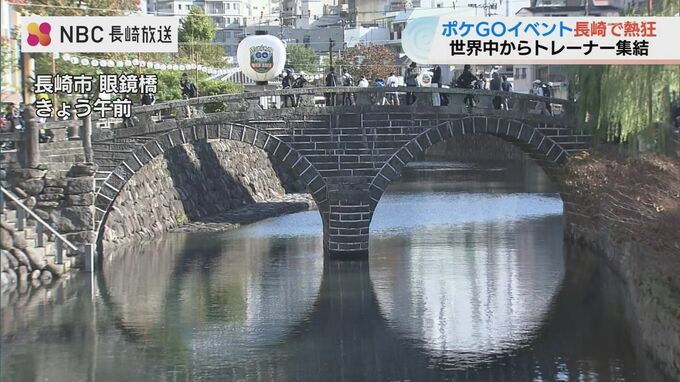 観光名所の眼鏡橋にも”トレーナー”の姿が。長崎でしか手に入らない限定ポケモンをゲットしていました。