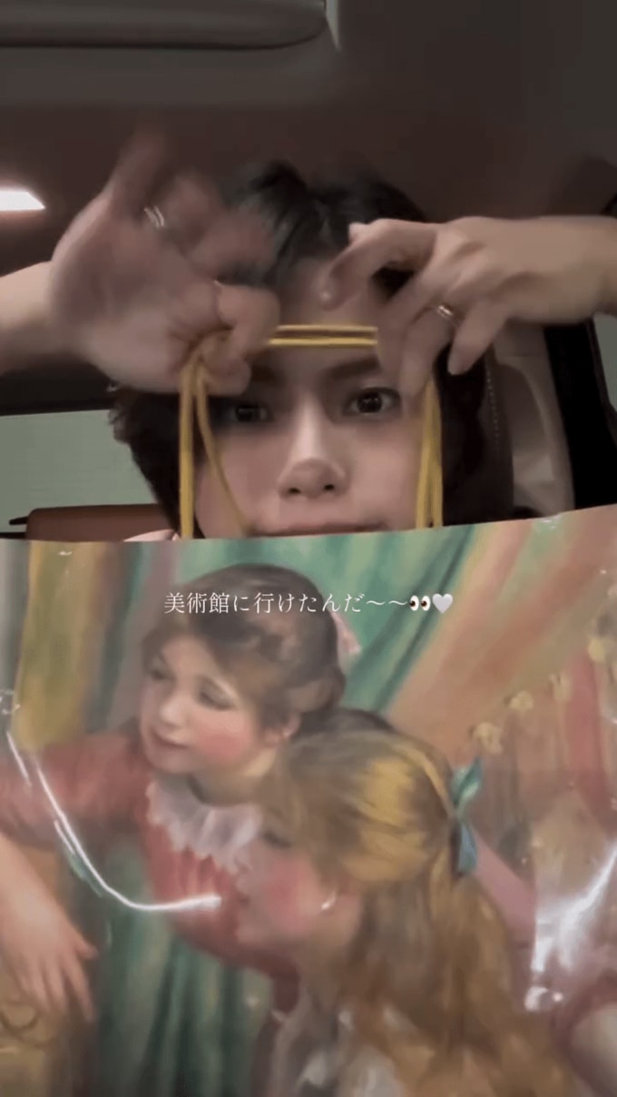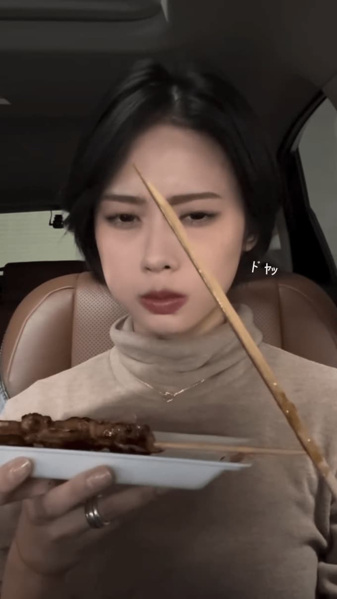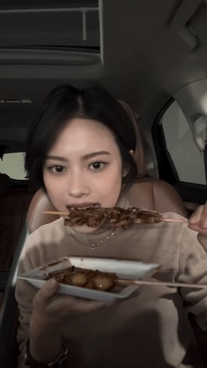 安斉さんは「久しぶりのお休みに」「秋を感じに紅葉を見に行き、美術館へ行けた日」とテキスト。一方動画では、駐車している自動車の座席で、ホタテや牛タンの大きな串焼きを堪能。