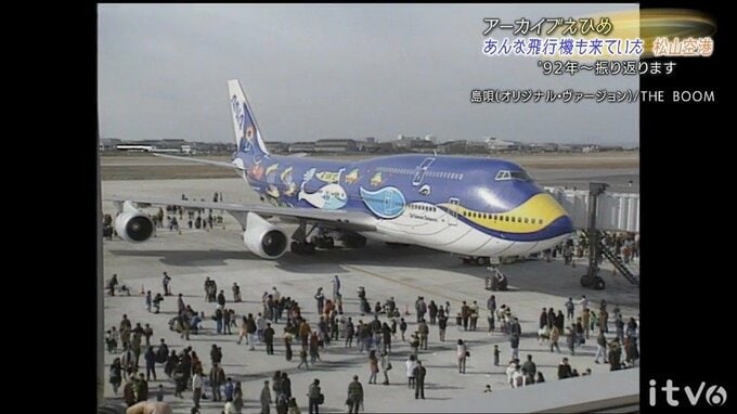濃い青色に塗られた機体、クジラの顔と海の生き物が描かれた「マリンジャンボ」です。