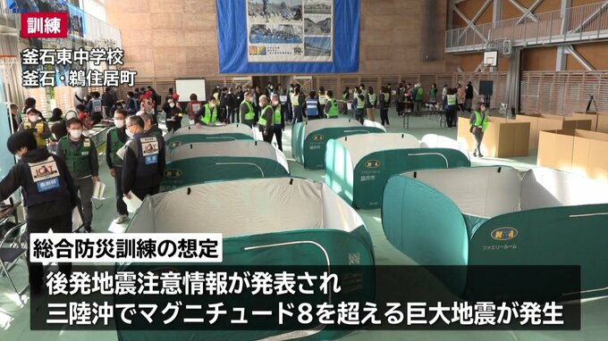 会場のひとつ釜石市の釜石東中学校の体育館では、地震から1週間程度が経過した状況を想定し、医療や福祉の関係者が避難者支援における連携を確認していました。