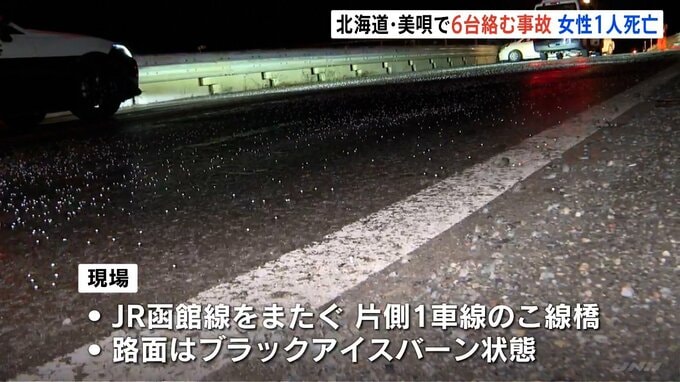 7日夜、北海道美唄市の国道で車6台が絡む事故があり、女性1人が死亡しました。