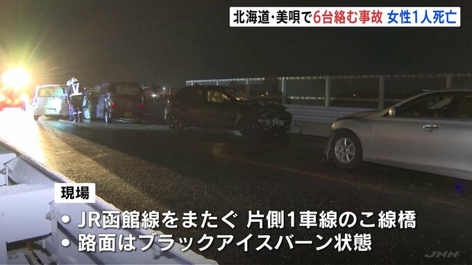 きのう夜、北海道美唄市の国道で車6台が絡む事故がありました。きのう午後8時すぎ、北海道美唄市の国道12号で車6台が絡む事故が起き、男女3人が病院に運ばれ、このうち女性1人の死亡が確認されました。現場はJR函…