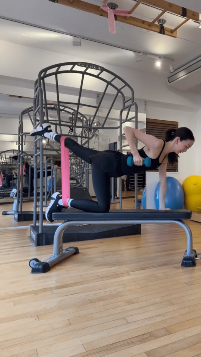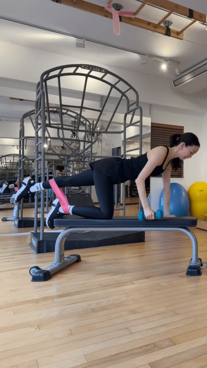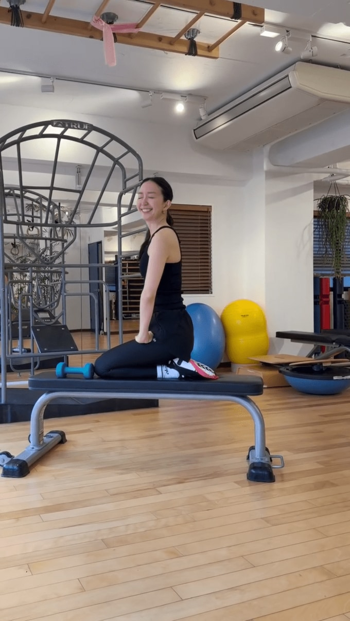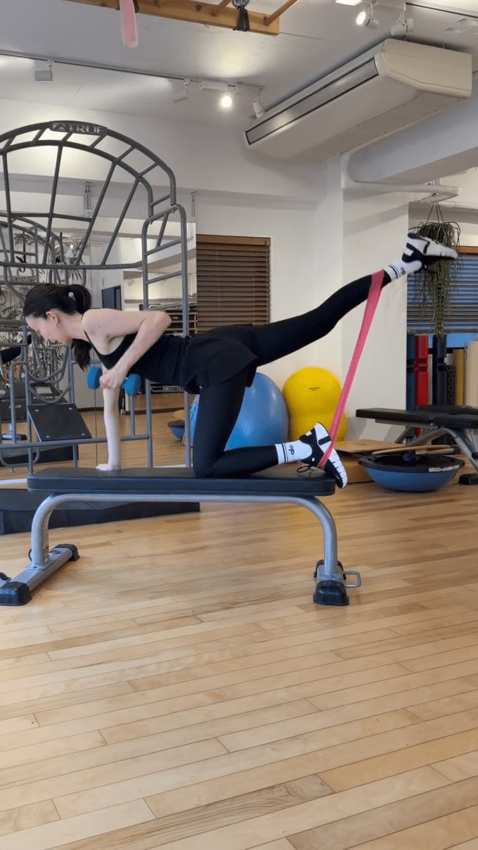 松島さんは、細いフラットベンチの上に左手と右膝をつき、右手にダンベル・左足にチューブをかけて、右手と左足を同時に上げて背筋を反らせるという、主に体幹を鍛えるワークアウトに取り組んでいます。