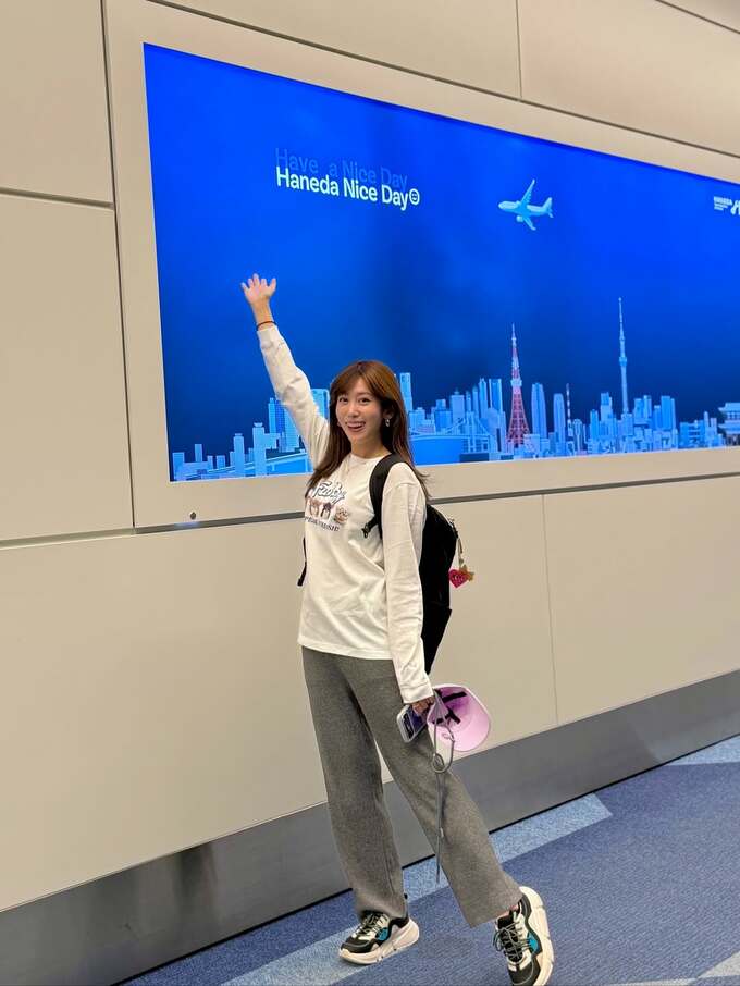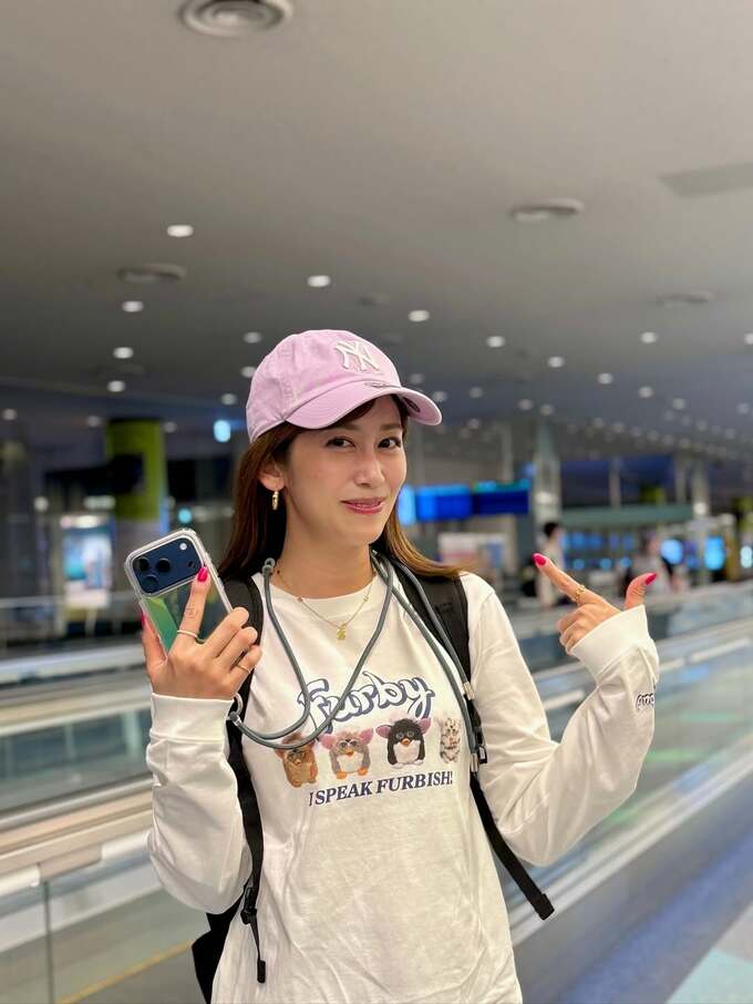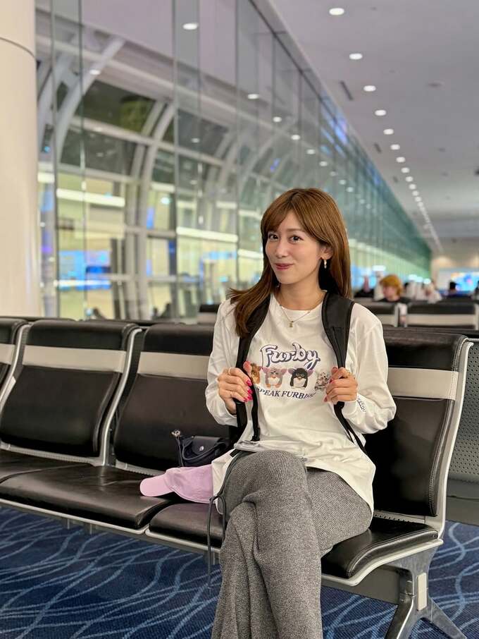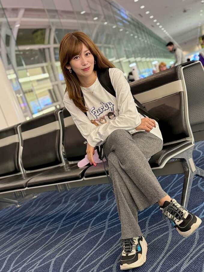 中川さんは「フリーになってから初の海外ロケ」とテキスト。羽田空港の出発ロビーのベンチに座り、バックパックを背負って、オフホワイトの長袖Tシャツとオーバーサイズのリブスウェットパンツにスニーカーを合わせた “とにかくラク” なスタイルで微笑んでいます。