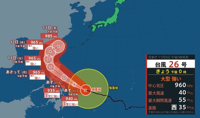気象庁によりますと、台風26号は8日正午現在、北緯12度35分、東経131度25分に位置しています。中心気圧は960hPa、中心付近の最大風速は40m/s、最大瞬間風速は55m/sとなっています。台風の大きさは「大型」で、強さは「強い」と分類されています。