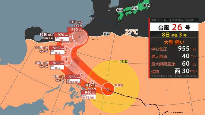 台風26号は発達しながら進んでいますが、9日(日)の935hpa最大風速50m(予想)をピークに、13日(木)午後3時には990hpa最大風速30mまで衰える見込みです。