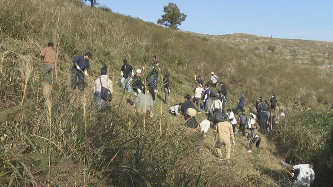 この火道切りは、山焼きに向けて幅6メートルほどの草を刈り、防火帯を作る作業です。連合山口の組合員など700人近くが参加しました。