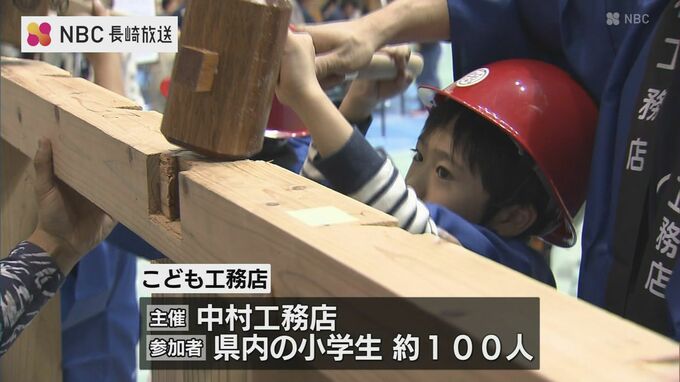 大工、設計、塗装、内装など家づくりに関わる9つの仕事を体験します。長崎市の県立総合体育館で行われたこのイベントは子ども達に建設業への興味を持ってもらおうと、中村工務店が開催したもので、4回目となる8日は、小学生、およそ100人が参加しました。