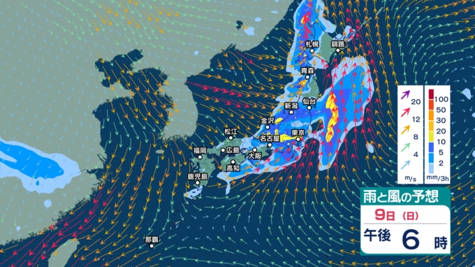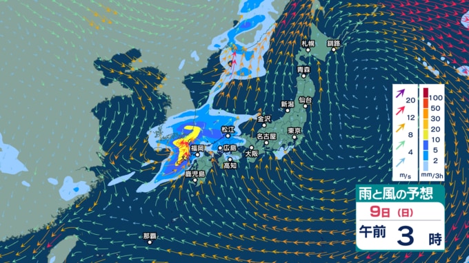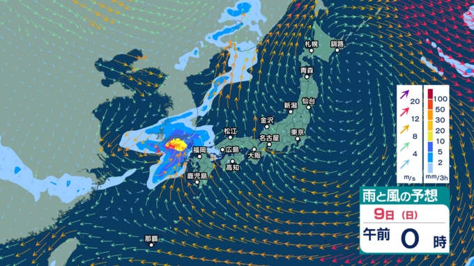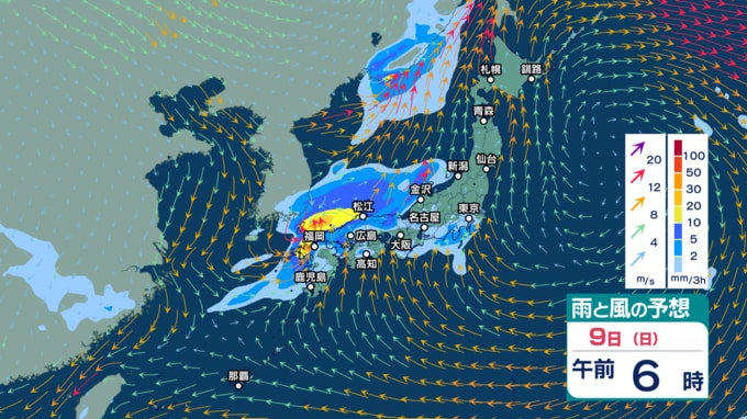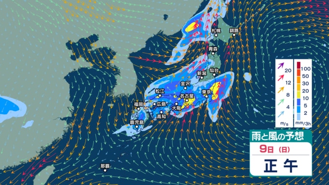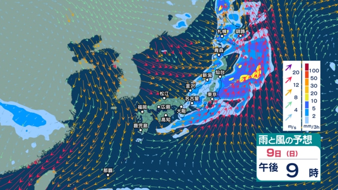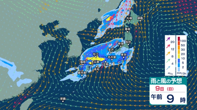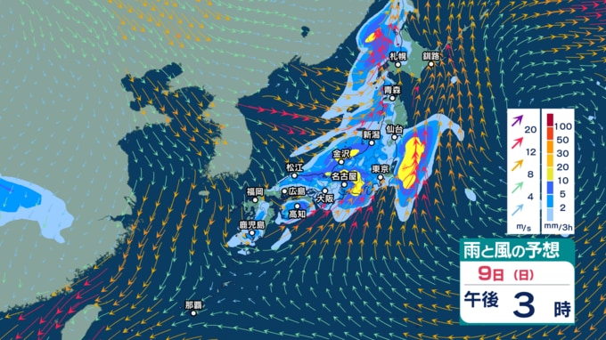 また、あす9日から10日にかけては前線を伴った低気圧が日本付近を通過する見込みで、西日本から北日本の広い範囲で雨が強まりそうです。西高東低の気圧配置となり、日本海側を中心に風も強まる見込みです。