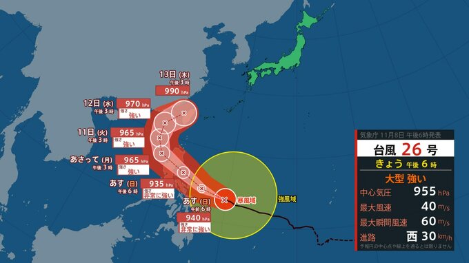 中心の気圧は955ヘクトパスカル、中心付近の最大風速は40メートル、最大瞬間風速は60メートルとなっています。