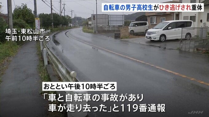 おととい、埼玉県東松山市の路上で、自転車に乗っていた男子高校生が車に追突され、意識不明の重体です。警察はひき逃げ事件として捜査しています。おととい夜、東松山市の路上で「対向を走っていた車と自転車の事…
