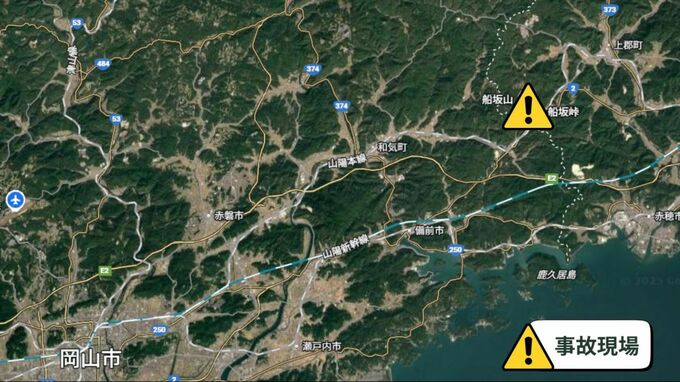 きょう(9日)午後1時30分過ぎ、岡山県備前市三石の国道2号・船坂山トンネルの西側手前付近で、軽乗用車同士が正面衝突する事故がありました(【画像①】は、事故現場の地図)。