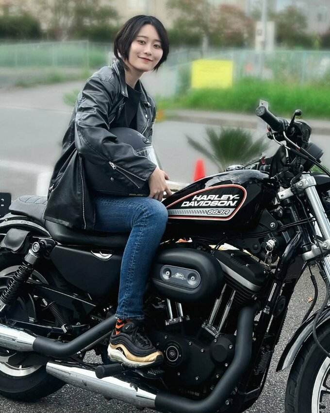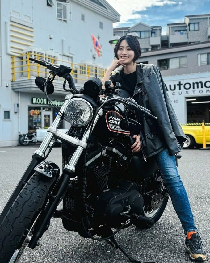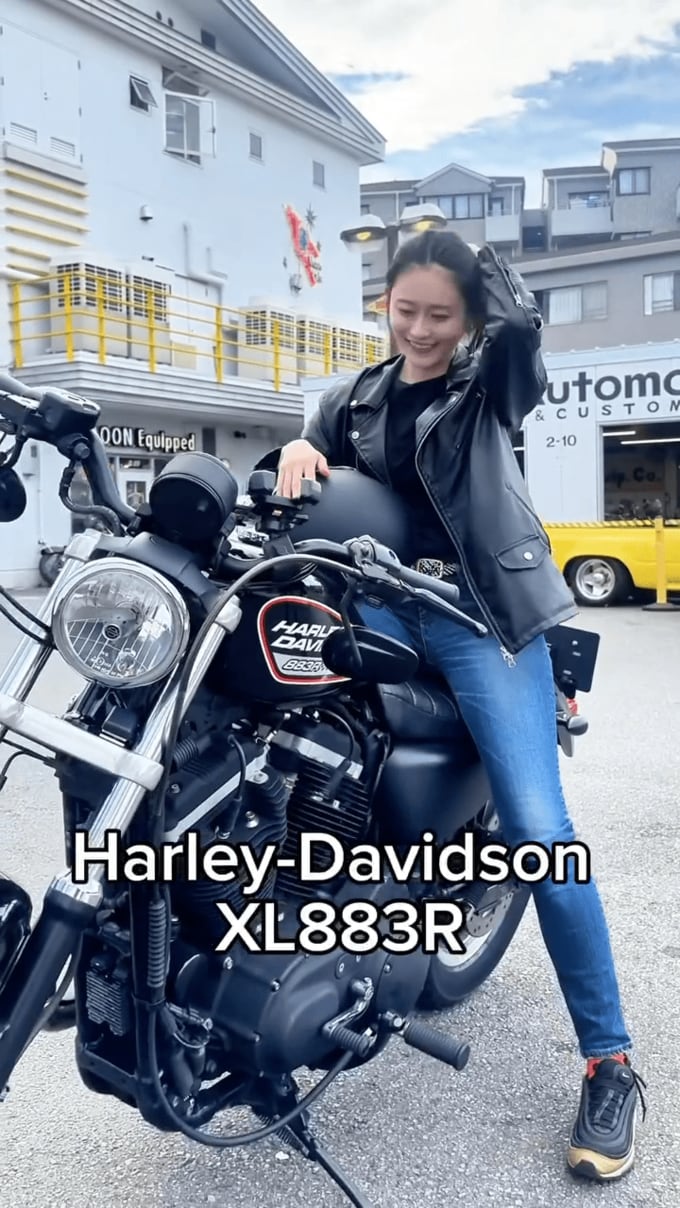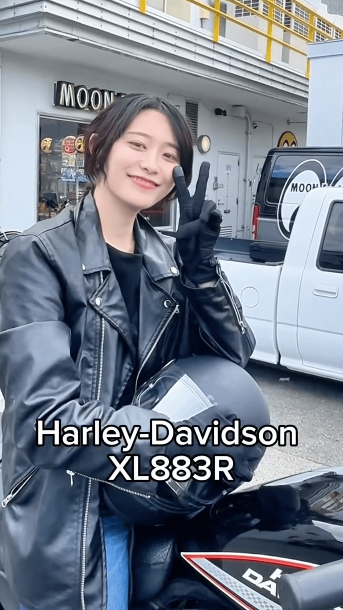 投稿された動画では「実はこんなバイク乗ってます」というコメントと共に、彩雪さんが、愛車の「Harley-Davidson XL883R」に跨り、様々な表情でポーズを取る姿が見て取れます。