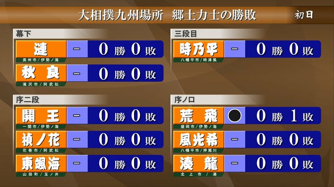 序ノ口筆頭の荒飛は序二段の力士に敗れました。その他の郷土力士の取り組みはありませんでした。