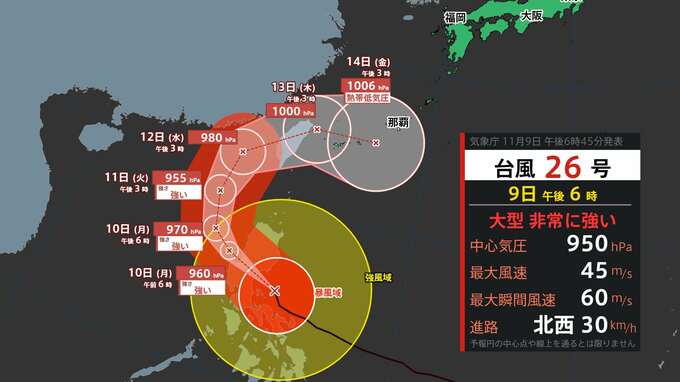 「大型で非常に強い台風26号」は、先の台風25号の爪痕が残るフィリピンに上陸する見込みです。このあと”Uターン”するコースを取り台湾方面に向かいますが、その台湾付近で勢力を落とし、14日(金)には沖縄の南で「熱帯低気圧」に変わる見込みです。