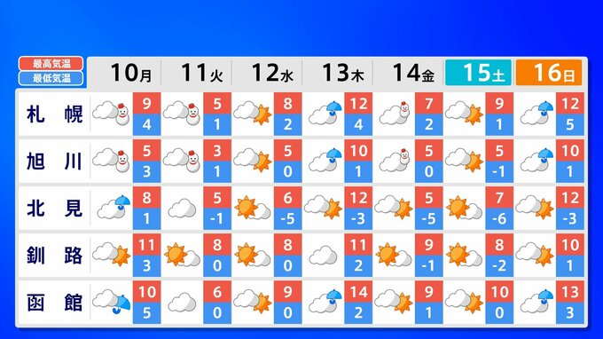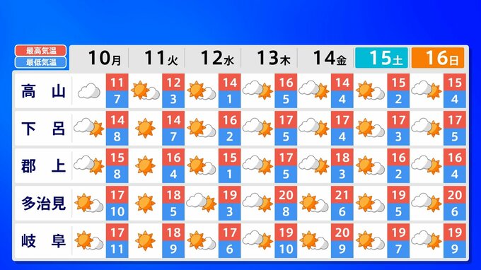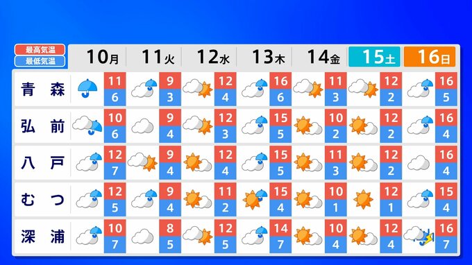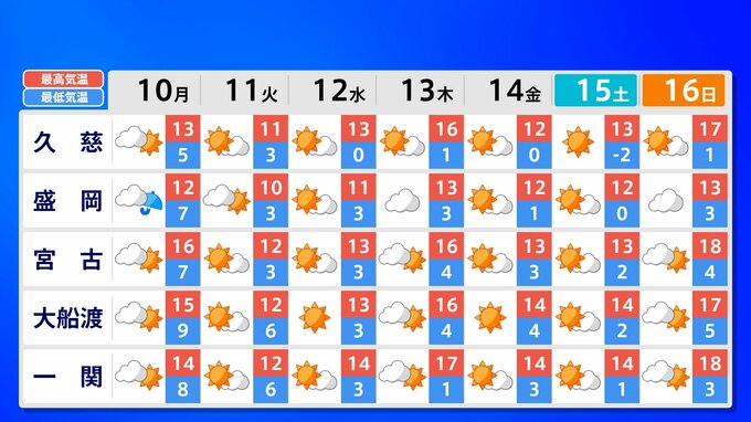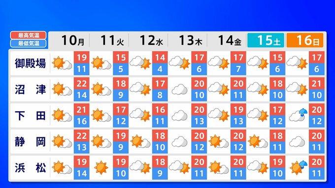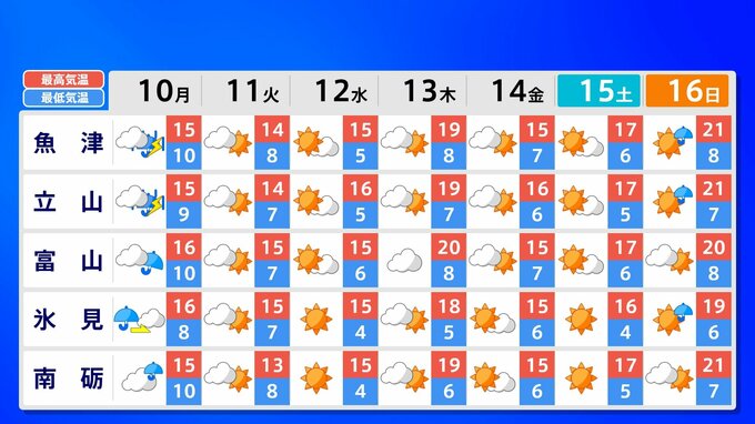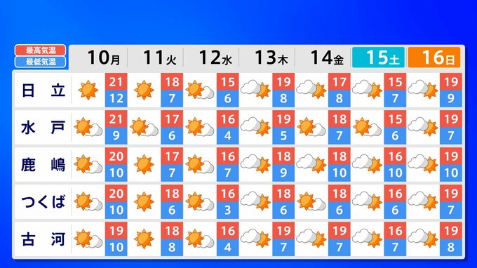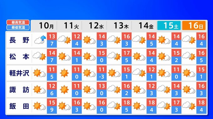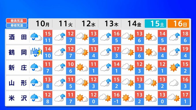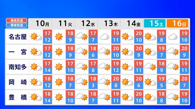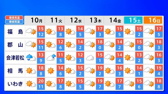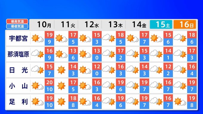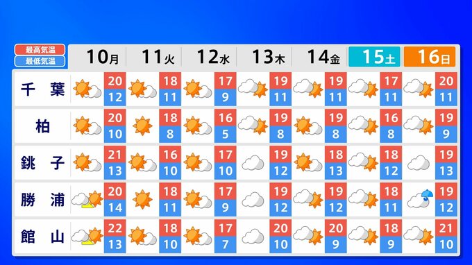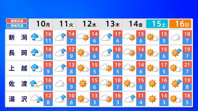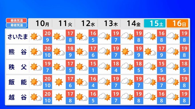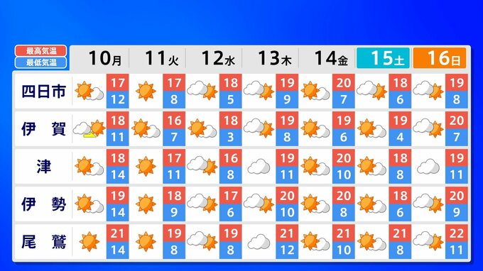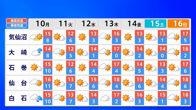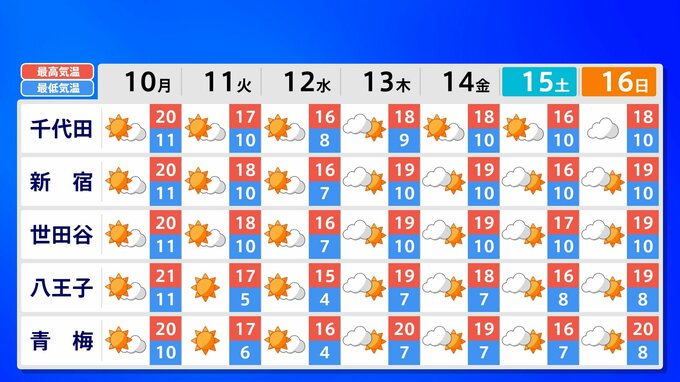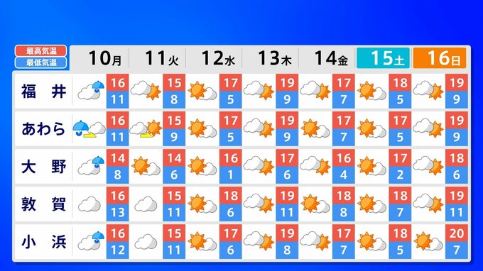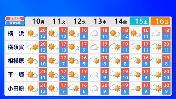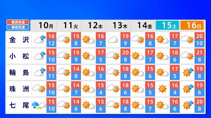 全国各地の16日(日)までの週間予報を画像で掲載しています(各県5か所ずつ)。移動性高気圧が通過し、今週は晴れる所が多いでしょう。「七五三参り」が集中する15日(土)16日(日)も晴れマークが多くなっています。沖縄・奄美は台風26号が持ち込んだ雨雲の影響で、雨の日が続くでしょう。