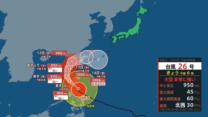 中心の気圧は950ヘクトパスカル、中心付近の最大風速は45メートル、最大瞬間風速は60メートルとなっています。