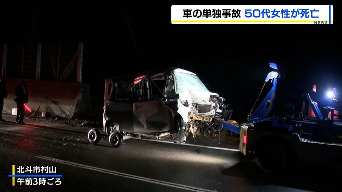 9日、北海道北斗市の国道で、軽乗用車がコンクリート壁に衝突し、運転していた53歳の女性が死亡しました。