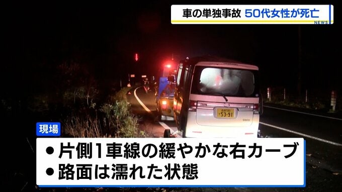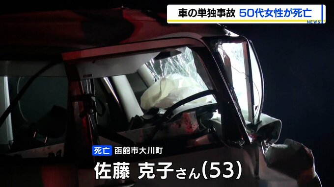 警察によりますと、軽乗用車を運転していた佐藤克子さん(53)が意識不明の状態で病院に運ばれましたが、死亡が確認されました。