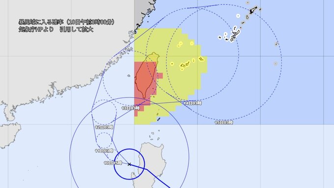 台風の中心は、24時間後の10日午前6時には、南シナ海の北緯19度20分、東経117度40分を中心とする半径65キロの円内に達する見込みです。