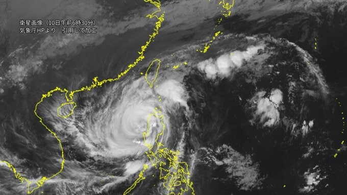 大型で強い台風26号は、10日午前6時には南シナ海の北緯17度05分、東経119度30分にあって、1時間におよそ30キロの速さで西北西へ進んでいます。中心の気圧は970ヘクトパスカル、中心付近の最大風速は35メートル、最大瞬間風速は50メートルで中心から半径130キロ以内では風速25メートル以上の暴風となっています。