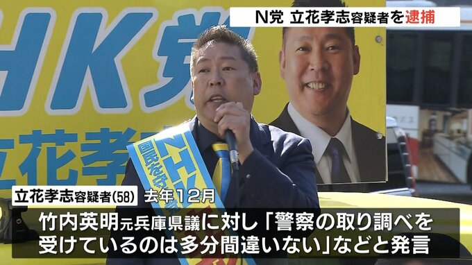 元兵庫県議の名誉を毀損した疑いで、「NHKから国民を守る党」の党首・立花孝志容疑者が逮捕されました。 警察によりますと、立花孝志容疑者(58)は去年12月、自身が立候補した選挙の街頭演説で元兵庫県議…