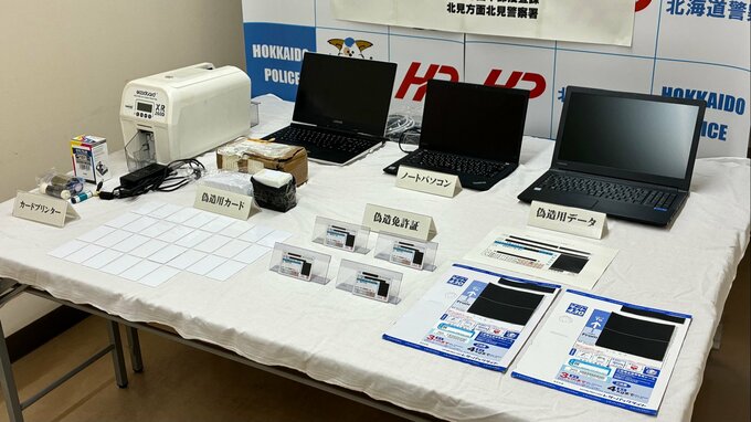警察は10日、男の自宅から押収した偽造免許証や偽造データが入ったパソコン、カードプリンターなどを証拠品を公開しました。