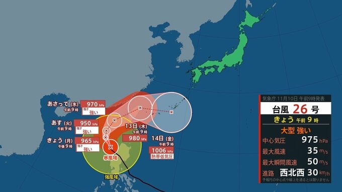 大型で強い台風26号は、きょう(10日)午前9時現在、南シナ海を時速30kmの速さで西北西へ進んでいます。