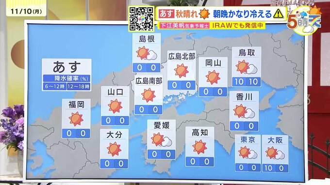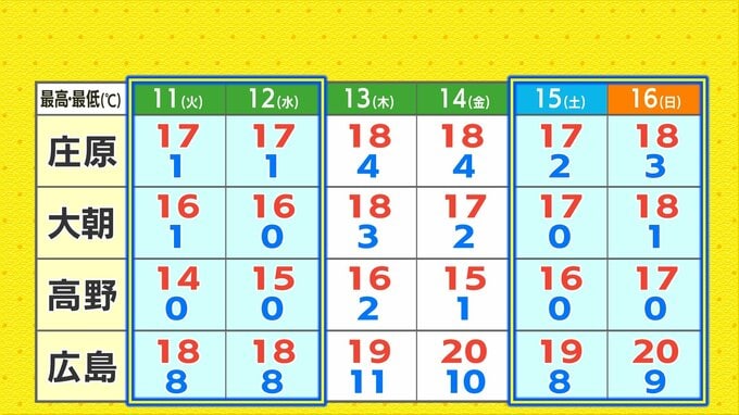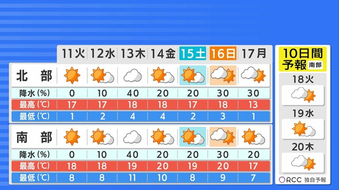 11日(火)安定した晴天続く 風が穏やかで過ごしやすい 朝の冷え込みに注意