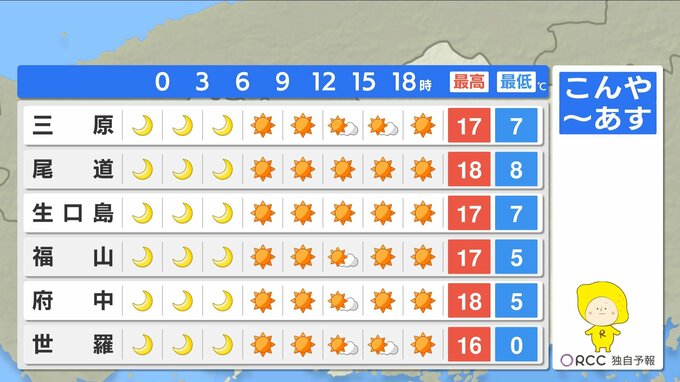 あすの朝は、沿岸部でも1ケタの冷え込み、北部や内陸部では0℃近くまで冷え込むでしょう。寝ている間に風邪を引かないよう、今晩は暖かくしてお休みください。最高気温は16℃~18℃の地点が多く、この時期らしい気温になるでしょう。一日の寒暖差がかなり大きいですのでご注意ください。