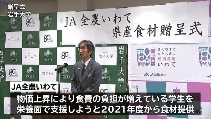 JA全農いわては、物価上昇により食費の負担が増えている学生を栄養面で支援しようと、2021年度から県内の大学への県産食材の提供を行っています。