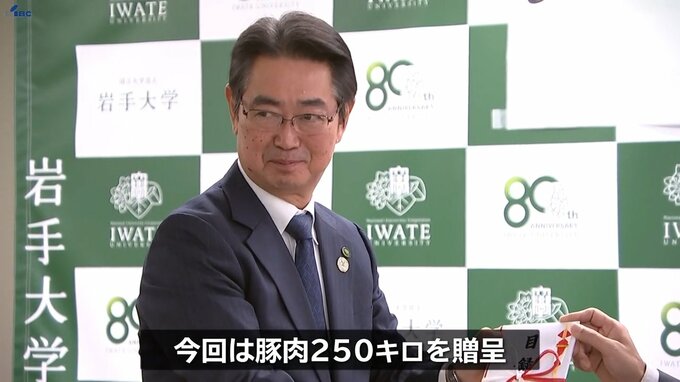 10日は岩手大学で贈呈式が行われ、今回は豚肉250キロが贈られました。
