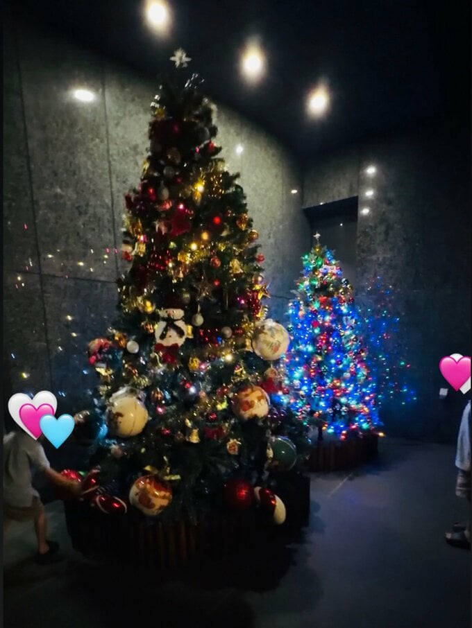 投稿された写真には、室内に展示された2本のクリスマスツリーが写っています。周囲は黒い大理石風の壁の暗い空間となっています。左手前の大型ツリーには暖色系のライトと金色の装飾が多く、星形や雪の結晶、球状のオーナメントが豪華に飾り付けられています。一方、右側の小さなツリーは青と白の光で彩られ、密集したライトが星のようにきらめいています。