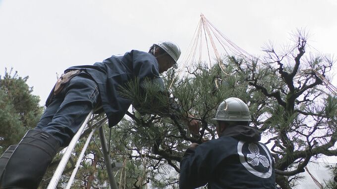 市から委託された造園業者が、高さ8メートルの支柱から放射状に伸ばした縄で枝をつるす、伝統的な「りんご吊り」の技法でクロマツに雪吊りを施していきました。