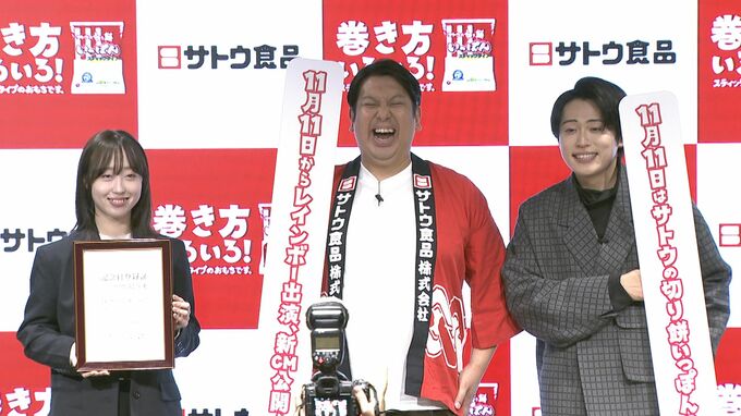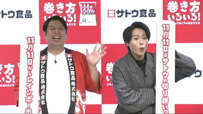 お笑いコンビ・レインボーの池田直人さん、ジャンボたかおさんが「サトウの切り餅いっぽん新 WEB CM発表会&記念日制定式」に登壇しました。