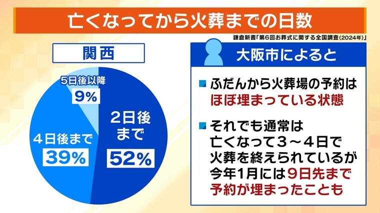 また、「それでも通常は亡くなって3~4日で火葬を終えられているが、今年1月には9日先まで予約が埋まった」という事例もあるということです。