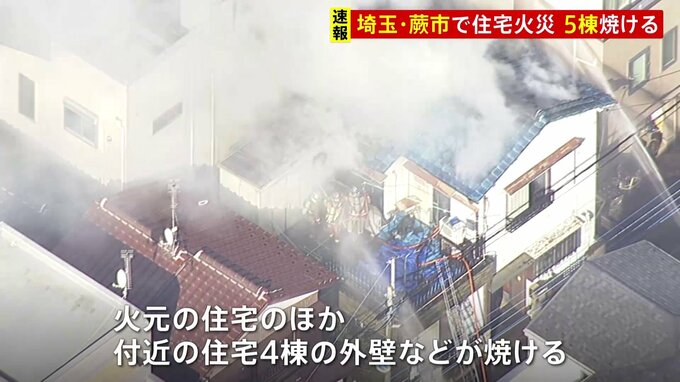 きょう午前、埼玉県蕨市で火事があり、火元の2階建て住宅などあわせて5棟が焼けて、現在も消火活動が続いています。けが人や逃げ遅れの情報はないということです。午前10時前、蕨市南町で近隣の住民から「1階から…