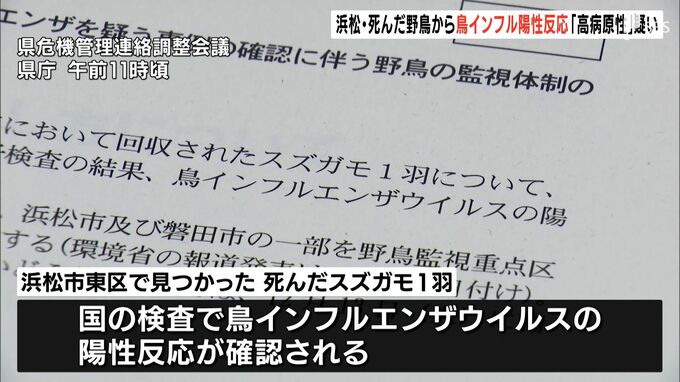 12月7日に浜松市東区で見つかった死んだ野鳥から、鳥インフルエンザウイルスの陽性反応が出たことが分かりました。致死率が高い「高病原性」の疑いがあり、静岡県は警戒を強めています。静岡県は12月12日午前に会…