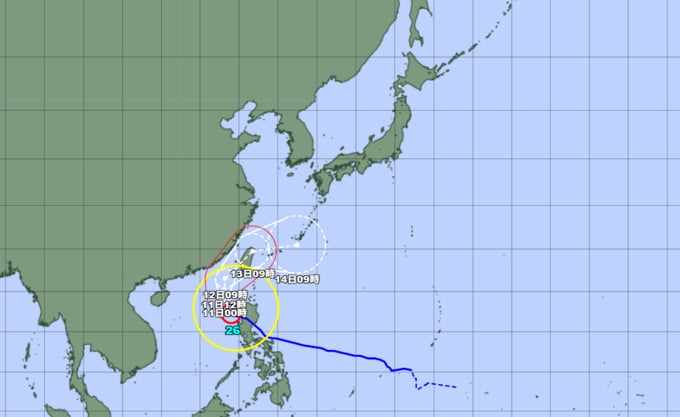 進行方向、速さ 西北西 20 km/h (10 kt)