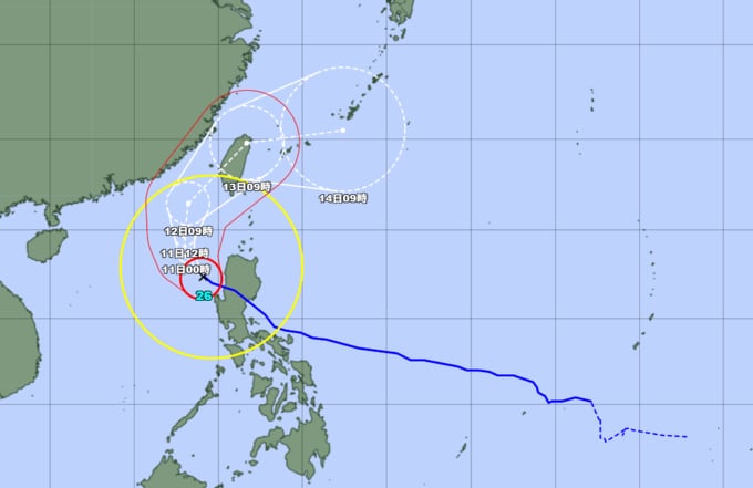 25m/s以上の暴風域 南西側 150 km (80 NM)