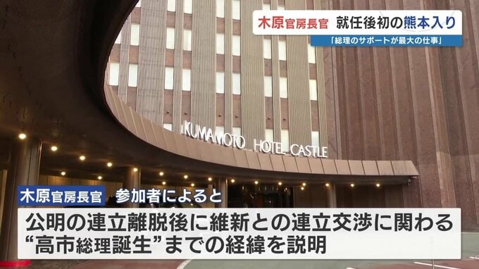 参加者によりますと、木原官房長官は、公明党の連立離脱後に日本維新の会との連立交渉に関わったことなど、高市総理大臣誕生までの経緯を説明した上で「高市総理のやりたい事をサポートする、支えていくのが私の最大の仕事」と意気込みを語ったということです。