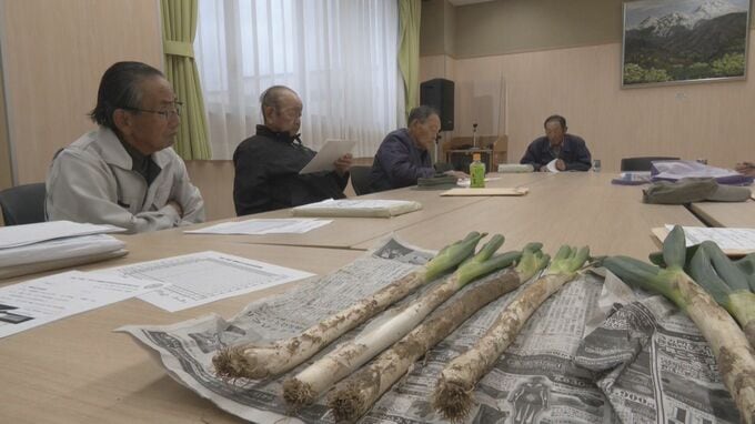 10日は生産者でつくる「丹生川飛騨ねぎ研究会」の会員らが集まり、今シーズンの出荷を前に、太さや長さなど選別の基準を確認しました。