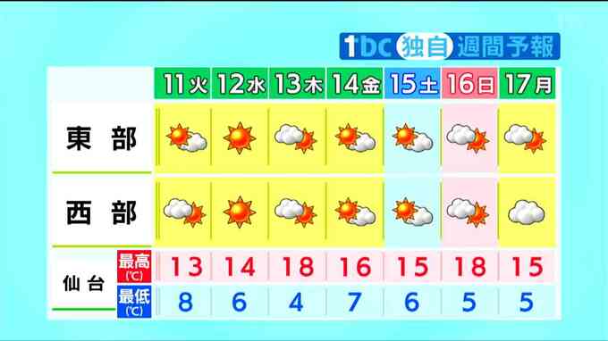 仙台では最高13℃、最低8℃、石巻では最高12℃、最低6℃が予想されています。