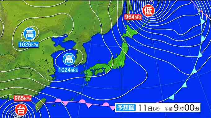 11日午前9時の予想天気図によると、北日本では冬型の気圧配置が続き、北海道では雪が降るでしょう。