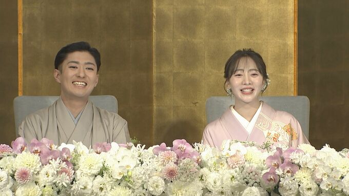 きょう会見を行うことは、橋之助さんたっての希望だったといい、“いやもう幸せです本当に。こうして金屏風の前で愛未と2人で皆さんの前でお話できるというのが何より幸せですし、実はここに来るまでは愛未より僕のほうがめちゃくちゃ緊張していたんですが、控室で(着物を着付けて)『完成した愛未』を見たら、すごくワクワクの気持ちが勝ってきて、今は緊張というより幸せでいっぱいでございます”と会見の冒頭から喜びを隠しきれない様子。