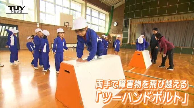 児童がまず挑戦したのは、両手で障害物を飛び越える「ツーハンドボルト」という技です。