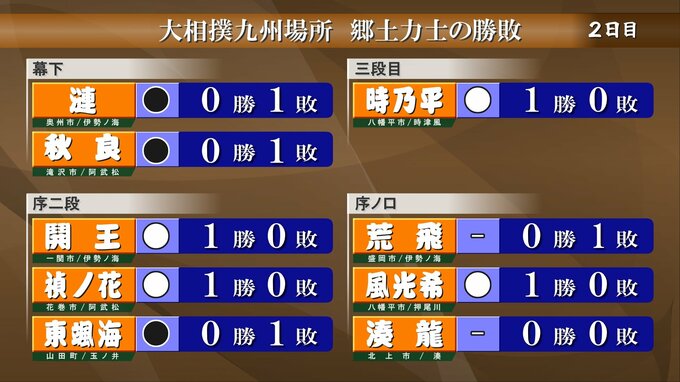 大相撲九州場所2日目、郷土力士の勝敗です。