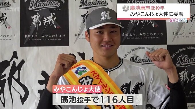 現在、宮崎県都城市で秋季キャンプを行っている千葉ロッテマリーンズのルーキーで、都城農業高校出身の廣池康志郎投手が、市の魅力を発信する「みやこんじょ大使」に委嘱されました。10日は、キャンプ地の都城運動…