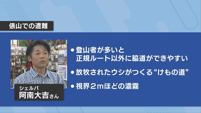 捜索に参加 阿南大吉さん「みんなが登りやすい山ということで、正規ルート以外に大勢の人に踏み固められて脇道ができやすい。放牧された牛がつくる獣道もあって迷いやすい。また、昨日は視程2mほどの濃い霧が出ていた。慣れた山でも慎重に、が大切」