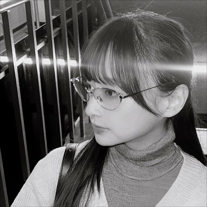 グレーのタートルネックと薄いグレーのカーディガンを身につけた影山さんは、長い黒髪が特徴的で、カメラに向かって微笑んでいる姿や、ウィンクしている表情などが写っています。